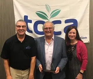 TOCA Executive Director Den Gardner (left) and Project EverGreen Executive Director Cindy Code (right) present Norman Goldenberg with the 2019 Environmental Communicator Award.